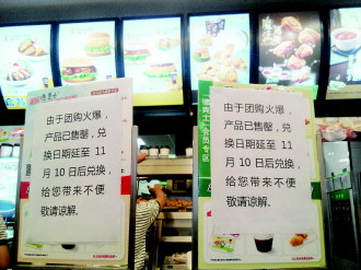 张先生称自己听朋友说大众点评网新注册用户可以花一分钱团购东西,自己抱着试试的心态注册了。“我花了一分钱团购了德克士双人套餐,28日到德克士滕州贵诚店进店消费时,工作人员指着张贴出的告示告诉我,因为供应不上,需要等到11月10日之后再去消费。”张先生说,“不管我花的钱多钱少,这是商家推出的活动,团购网站上是不是应该写清楚,让我白跑一趟。”张先生表示自己进店期间就看到两位消费者也遭遇了同样的事情。