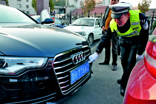4日下午历城交警大队洪楼中队民警在东外环山大北路交叉口执勤,一辆悬挂鲁HYY***黑色奥迪轿车开过来。检查发现该车牌对应的是一辆尼桑越野车。