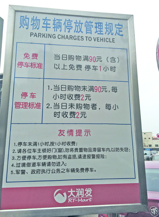 记者走访历下区4家大型超市后发现,超市都执行物价局制定的每小时2元的收费标准,但是在最低购物标准上,不同的超市差别比较大。其中标准最高的是银座商城停车场,200元以下免费停车一小时,201元—1000元免费停车2小时,1001元—2000元,免费停车4小时。大润发超市免费停车标准为,当日购物满90元(含)以上免费停车1小时;未满90元或者未购物者,仍执行每小时2元的标准。优品汇奥特莱斯购物广场的停车收费标准为满50元即可停车2小时,200元以上即可停车至当天24:00。
