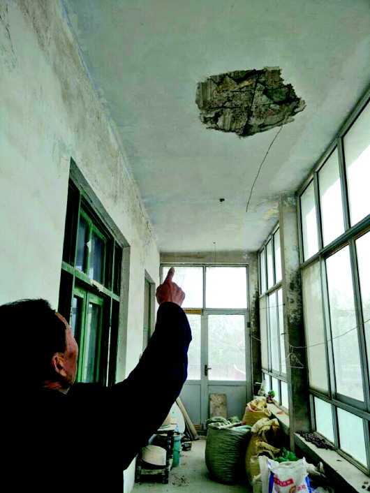石料厂为了开山凿石,有时候还填坑开炮。在王强家里,记者看到房屋厦子上有一块厦顶已经掉落。屋里的天花板也有部分被震坏,有些房屋的墙体还出现了数条裂缝,裂缝最宽处足有3厘米。