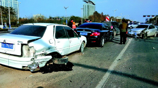 本报11月6日讯(记者 石剑芳) 11月6日下午1点半左右,在经十东路与章丘市世纪西路交叉路口发生一起交通事故。七辆私家车发生连环碰撞,所幸没有人员伤亡。