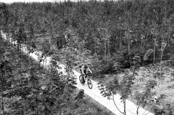 骑车穿行于红枫林中,别有一番韵味。本报记者 张晓科 摄