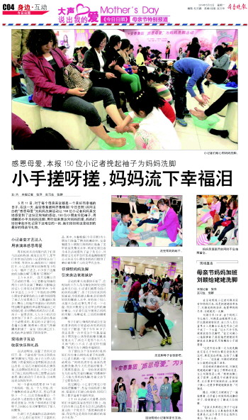 2014年5月,母亲节当天,100名小记者现场为妈妈洗脚,感恩妈妈的养育之恩,表达对妈妈的爱与祝福。看着孩子们耐心仔细地按摩、搓洗。不少妈妈当场流下感动的泪。