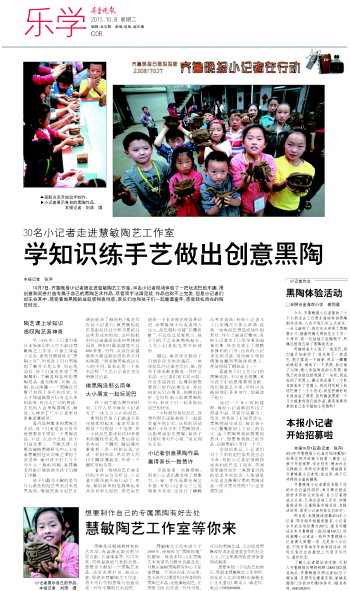 2013年10月,30名小记者走进慧敏陶艺工作室DIY黑陶,重温了玩泥巴的乐趣。一件件作品在孩子们手中逐渐成形,变成了各种各样有趣的造型,孩子们别提有多开心了。