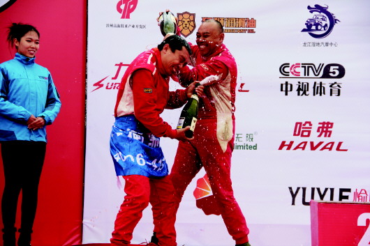 颁奖仪式上,获奖车手用香槟庆祝比赛圆满结束。 本报记者 王晓霜 摄