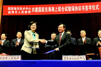 6日,国家海洋技术中心与威海市政府共建国家浅海海上试验场协议签字仪式在蓝天宾馆举行。根据规划,试验场总投资约4.59亿,预计3-5年建成,将成为首个国家级浅海海上试验场,有利于吸引越来越多的国内外一流海洋科学研究机构、专家和学者落户威海。图为国家海洋技术中心主任罗续业、威海市委副书记、市长张惠在共建协议书上签字后握手祝贺。