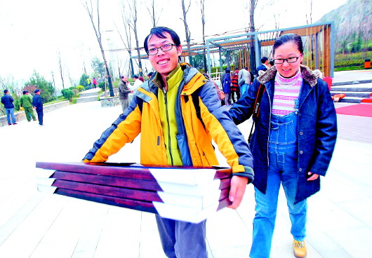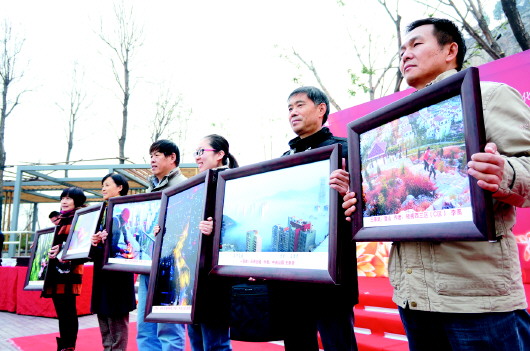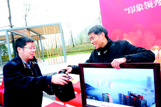 每位获奖者的作品都被精心装裱起来,这是二等奖获得者郝爱和丈夫将一大摞照片抱回家。