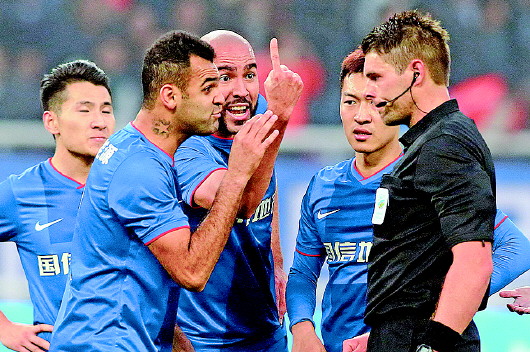 舜天队员对裁判判罚不满。 本报记者 王鸿光 摄