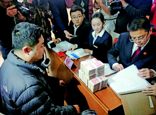 10日,返还款发放现场,8年前购买白领公寓房屋的杨先生第一个领到了返还款48万余元。 本报记者 王光营 摄