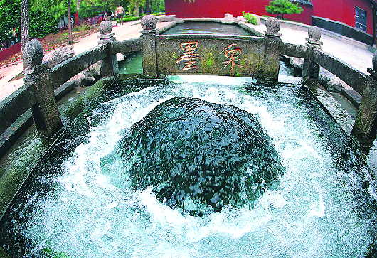 我还没到那,从远处就看到泉水边站满了赏墨泉的人。他们有的低头观赏,有的拿相机或手机拍照留念。从游人的间隙望去,不小的泉池中,一股墨一样的泉水从巨大海碗似的泉池中奔涌而出,哗的奔向北面的水道。这泉黑得如墨,如包青天的脸。如挥笔用池中之墨写字,谁的字也不能与之相比。我看着伸手在水中了一下,清凉甘纯。真不失为宝泉之水。正好旁边有个导游过来,向游客讲解。原来墨泉名因泉井深幽,水色苍苍如墨而名墨泉。这一圣景吸引无数的历史名人,争相观看,写下无数的诗赞美。