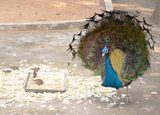 时间:2014年11月6日 自述:众目之下,孔雀喜欢展示美丽的羽毛,而麻雀却在趁机抢食。 点评:都属于鸟类,可真确实不一样。