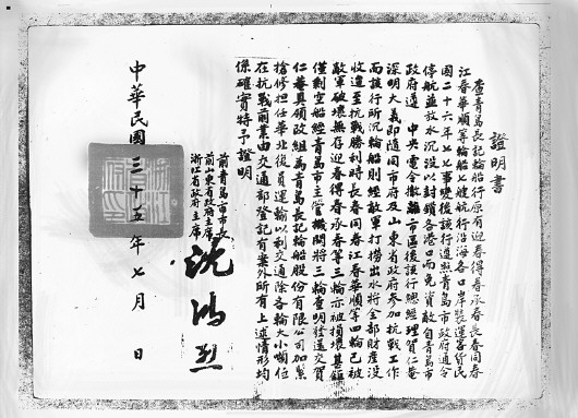 为此,前青岛市长沈鸿烈特意写下证明书:“查青岛长记轮船行原有迎春、得春、承春、长春、同春、江春、华顺等轮船七艘航行沿海各口岸装运客货。七七事变后该行遵照青岛市政府通令停航并放水沉没以封锁各港口而免资敌。”当时的交通部也专门为此向贺仁庵颁发了奖章。