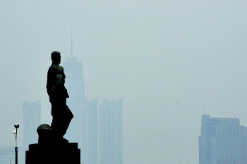 11日,烟台迎来雾霾天气,蓝天白云不见,灰色笼罩在城市间,能见度大幅降低。图为烟台港环岛附近,透过雕塑隐约能看到远处的建筑。