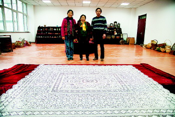 10日,家住牟平观水镇的王家卿老人(中)和自己创作的棒槌花边作品合影留念。据了解,这是一幅长2.4m×2.75m的巨幅牟平棒槌花边作品,这幅作品在上世纪80年代获得全国工艺博览会金奖,集栖霞、福山、蓬莱、牟平老花边艺人集体创作的精华。经过18个月的创作王家卿老人终于完成此作品。