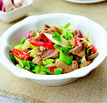 5.锅中留底油,烧热后将蒜末和大葱丝放入爆香。然后将羊肉片放入,再调入白砂糖、料酒、香醋和盐,大火翻炒片刻即可。