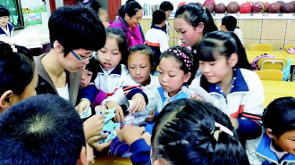 11日中午,经区新都小学各班级举行乐淘淘活动。各班家委会的成员把家长们捐赠的物品摆在桌子上,并定好价格。同学们兴高采烈地拿着自己一个月来通过参与学校班级活动和努力学习得来的班币,与家长们讨价还价,购买物品。