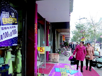 面对电商的“双11”购物狂欢节,线下一些实体店今年没有冷眼旁观。市区一些商铺不仅在“双11”当天做活动,更是将把“战线”延长,有意吸纳更多客流。据一品牌店店员介绍,今年他们线上线下都在搞促销,并且折扣一致。预计仅是“双11”当天,就可以赶超往日一周业绩。 本报记者 赵艳虹 摄影报道