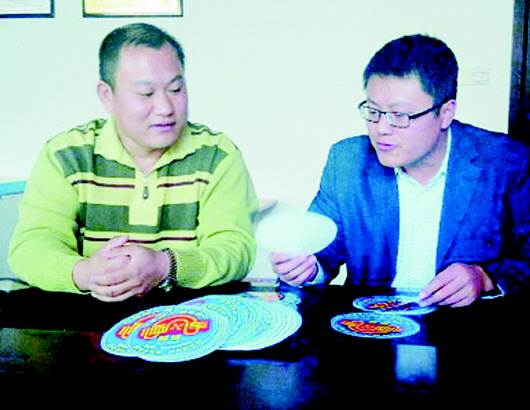 刁海刚(左)与聊城团市委相关负责人商量公益组织怎么发展。 本报记者 张跃峰 摄(资料片)