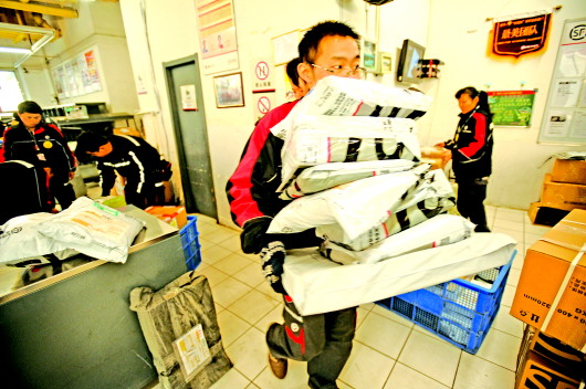 12日下午,在顺丰快递历下区分部,快递员忙着将自己负责区域的快件运到送货车上。“双十一”过后,各大快递公司纷纷进入工作高峰期,快递员这个群体进入最忙碌时段,差不多每天要接打二三百个电话,收发上百个快件,忙起来连喝水、上厕所都顾不上。 本报记者 戴伟 摄