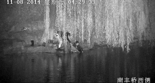 偷鱼的是一男一女两人。为逃避视频监控,两人破坏了大明湖东区南丰桥北侧的监控设备。他们虽将摄像头扳离了正常方向,却没料到自己的行为被桥西侧另一个摄像头完整记录下来。监控录像显示,7日晚上10点左右,一男一女出现在大明湖南丰桥。在勘察地形后,男子身着专业装备,带着捕鱼网进入水中。男子将网拉开,两头固定在湖面两端,之后上岸离开。