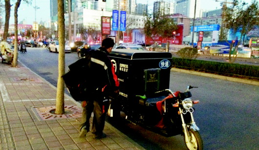下午不到3点,济南气温在10℃上下,李尧载着满车快件出发了。他说,虽然自己负责的片区不大,但是跑起来很是不容易。