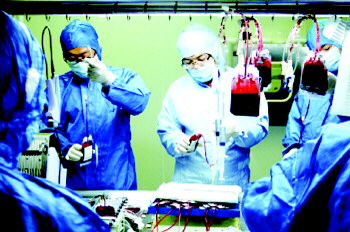 山东省脐血库工作人员将细胞保护剂注入脐血袋(资料图)。