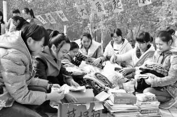 11月11日,聊城大学教育科学学院大学生志愿者举行为西部儿童募捐活动。许多大学生自发捐钱、捐书、捐衣物,奉献暖暖的爱心。志愿者们会将募得的善款和物品邮寄到新疆阿勒泰市阿拉哈克乡寄宿小学。