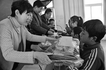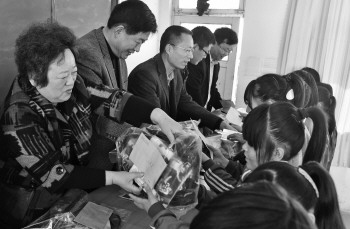 市政协副主席张广霞(左一)向获奖学生颁发奖学金及学习用品。