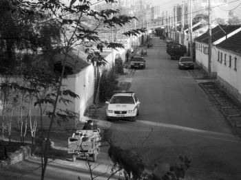 11月12日下午,在村口停放着调查案件的警车。 本报记者 马志勇 摄