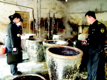 食药局工作人员正在检查豆腐黑作坊。(图片由通讯员提供)