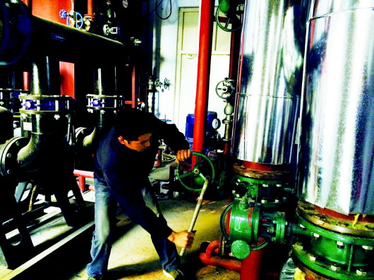 热力公司员工开启二级站阀门。 本报见习记者 杜雅楠 摄