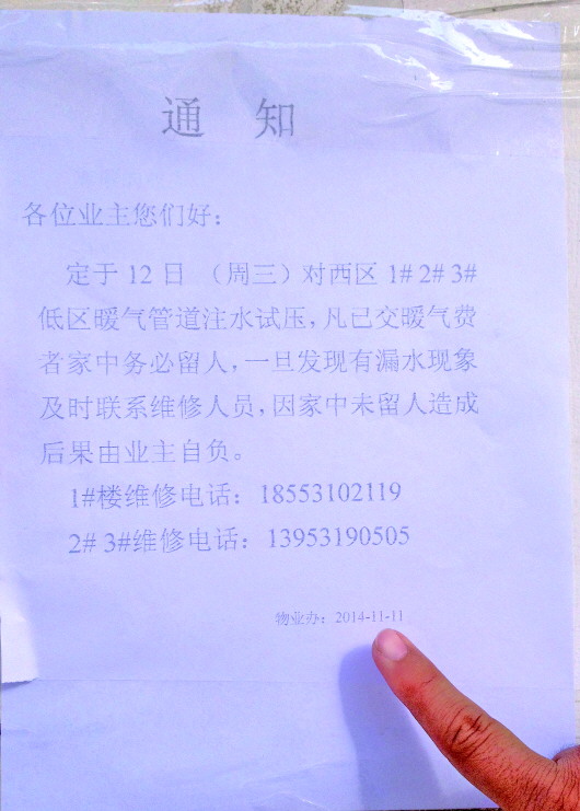 高层单元门张贴着试水通知,7层以上住户却未能实现供暖。