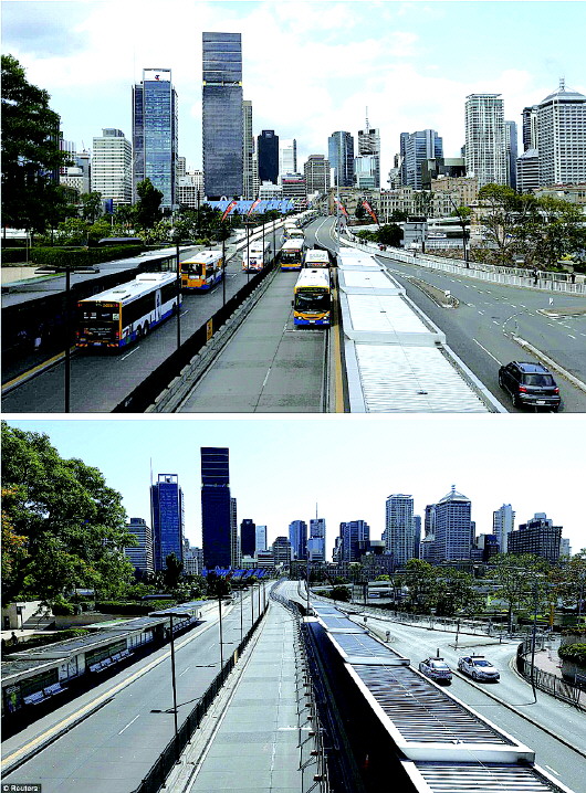上图:平日的布里斯班一条主干道交通繁忙。 下图:因为放假,同样的道路空荡荡的。