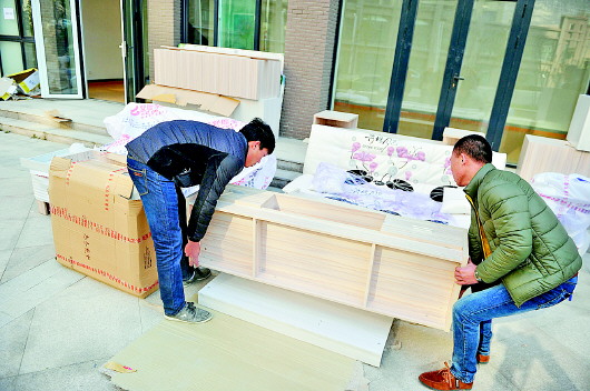 工作人员正在搬卸为公租房“量身定制”的家具。 本报记者 王媛 摄