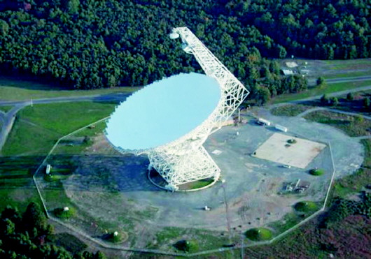 宇宙深处又有一颗星星诞生了,又有一颗星星死亡了……这些信息都可从射电望远镜接收的射电波中读出来。设在绿岸的这台射电望远镜高约150米,锅状定向天线直径为100米,24小时不间断运行,收集并测量天体射电的强度、频谱及偏振等。美国国家射电天文实验室主管霍尔斯坦介绍,这是全球最灵敏的一台射电望远镜,能够捕捉到“犹如一片雪花轻坠地面”的微弱信号,但要实现这一点,就必须保持周围“绝对宁静”。