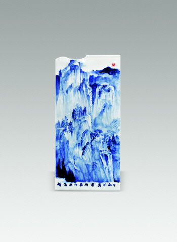针对瓷器造型的不同,叶建新“因型而作”,“型”是指瓶的造型,由于在创作中,瓶本身的造型有丰富的变化,所以构图也要有所变化,而且叶建新的釉下青花水墨瓷画还在青花料的运用方面去追求“运墨而五色具”的效果,成功地将中国水墨画艺术和陶瓷装饰艺术结合。纵观叶建新的青花瓷绘画,构图巧妙,充分考虑器型各个不同角度的观赏性,且每一个角度的青花瓷画面都保持着独立又与相邻画面相关联的样式,随着人360度绕瓶走动,呈现出一个又一个的视觉惊喜。时而清新自然,时而浑然大气,空幻溟濛的山水之境,气势磅礴的山川景象缓缓跃然瓷上,演绎了一个新的水墨形式——“水墨瓷画”。
