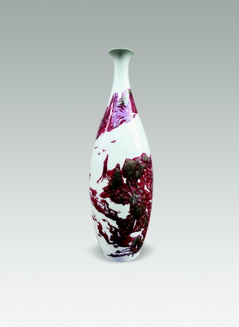 除了水墨青花瓷,叶建新也创作了部分釉里红作品。釉里红,是指用铜花为着色剂配制的彩料,在坯体上描绘纹样,再盖一层青白釉,然后装匣入窑,经1250℃~1280℃的高温烧制后呈现出的娇妍而沉着的红色花纹。釉里红的成色由氧化铜绘制煅烧而成,颜料配制严格,制作工序复杂,若稍有偏差,就有整窑报废的可能,是对画家的技艺考验极高的工艺创作。