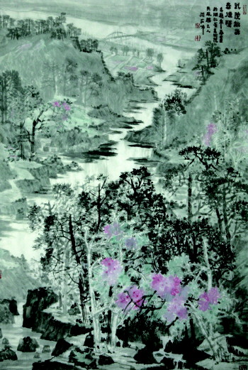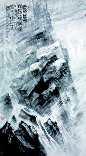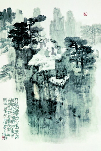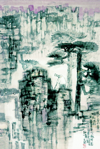 山水画图式的转换是画家对传统与现代之间的深刻理解和有机把握。新的山水画图式必须建立在对传统文化精华的深入解读和对人类文化的观照与借鉴上。周石峰在这一点上有着清醒的认识,他坚持在深入研究学习传统文化的基础上,寻求传统与现代之间的连接点,以构建自己的山水画语言系统。他将板块式大山丘壑隐退到轻烟般的迷漫背景中,少有奇峰耸峙,似树非树的线表现富生命力的流动之美,而他所刻意追求的“淡”的趣味,则始终洋溢着轻烟缥渺的精神氛围。