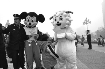 “米老鼠”和“喜羊羊”宣传限放规定。 本报记者 公素云 摄