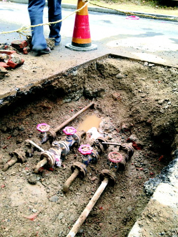 在小区西侧的出口处,记者见到了正在抢修管道的清泉供热公司的工作人员。工作人员已经将部分道路挖开,进行抢修工作。现场负责施工的工作人员介绍,因为修路,把埋在小区道路地下的主管道轧断了。