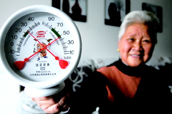 16日,怡景蓝湾小区的居民家里,室内温度达到24℃左右,老人笑了。本报记者 邓兴宇 摄