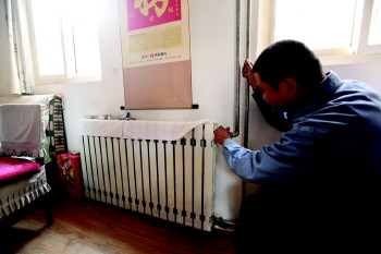 龙山换热站的工作人员在居民家中检查暖气热度。
