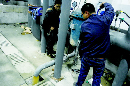 15日凌晨,滨城区2014年供热正式开始,热力公司总控平台、首站及换热站开启24小时人员值班制度,对供热情况进行实时监控,确保主管道及支管道运行正常。图为海通换热站工作人员正在反冲排污。