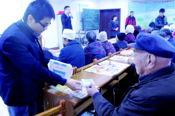 工作人员在为老人分发活血化瘀药品。 本报记者 刘光斌 摄