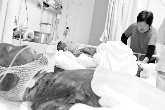拿着药膏,秦传运和海森姥姥不时给母子两个擦着,医生说,两个人现在最怕的是感染,所以两位老人一刻也不敢马虎。“虽已过了十几天,但大夫说母子两个要过危险期还得一两个月。”秦传运说。