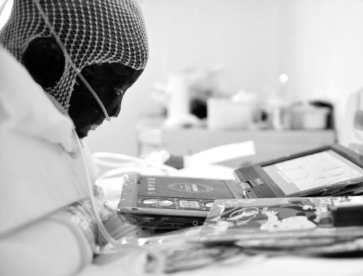 除了缠满全身的药布,每个病床旁还有一个红外线治疗仪,两位老人小心照料着,十几天没睡一个完整觉。刚刚咳完,女儿又渴了,海森姥姥拿起针管吸上温水,一点点推到女儿嘴里,十几天来,母子两个的饮食都靠老人一点点喂。