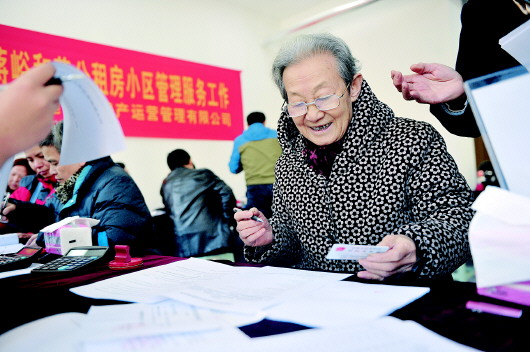 79岁的马老太正在填写合同,准备领取公租房钥匙。 本版摄影 本报记者 王媛