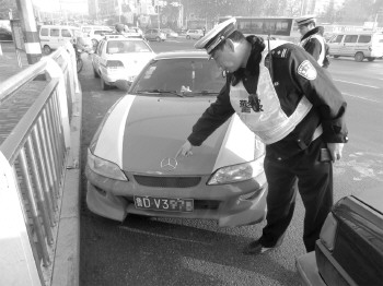 18日早晨,市交警三大队民警在青年南路与红旗中路交叉路口发现一辆配有奔驰车标的红色跑车,但不像是正常奔驰车辆应有的车型,怀疑是辆改装车,叫停在路边进行检查。