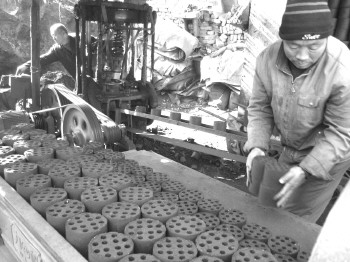 工人正在将蜂窝煤从煤球机上摆放到运煤球的车上