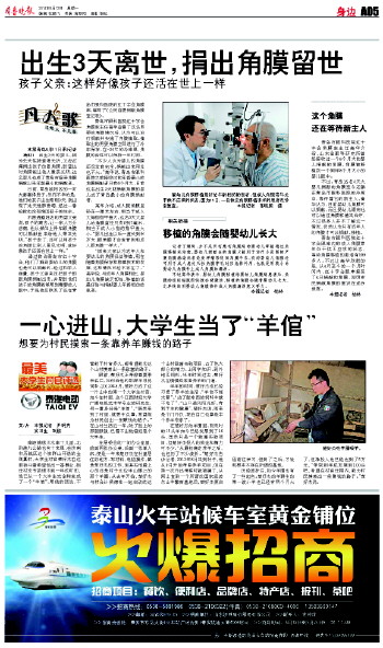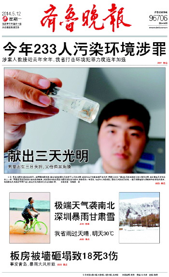 今年5月,青岛城阳区的一对夫妻喜得贵子,然而不幸的是,他们的孩子出生刚刚三天,就被诊断为先天性肺衰竭,经过一番抢救也没有挽回孩子的生命。不愿透露姓名的男婴父亲说,孩子的离去让一家人万分悲痛。他从媒体上得知人的眼角膜可以捐献给他人,通过咨询青岛市红十字会,了解到婴幼儿的角膜也是可以捐献的。和家人商量后,孩子父亲决定把孩子的眼角膜捐献出来,并期盼他们孩子的角膜能够给需要的人带去光明。于是他们联系了设在青岛市眼科医院的红十字会角膜库,填写了《公民自愿捐献角膜登记表》。